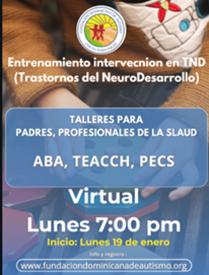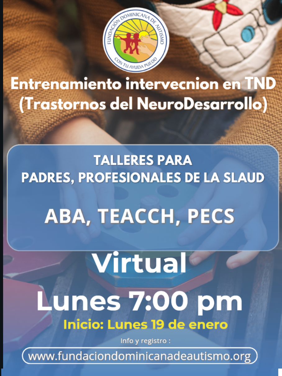 Metodología: 3 clases virtuales lunes de 7:00 a 9:00 pm por la plataforma zoom y Google class para las tareas. Y una (1) clase presencial para practicas al mes de lunes a viernes 8:am a 4:pm en las Instalaciones de la fundación dominicana de autismo,inc.